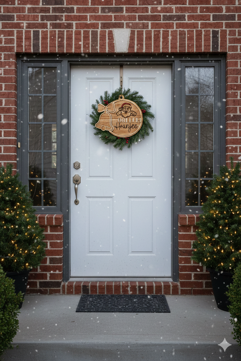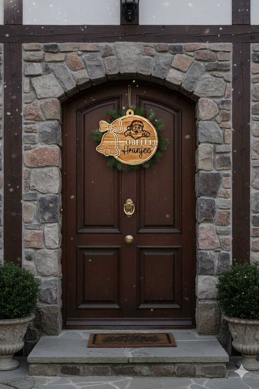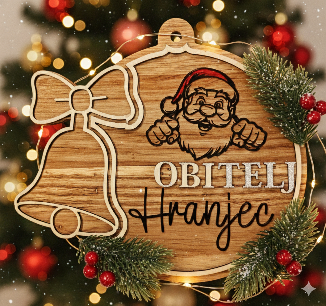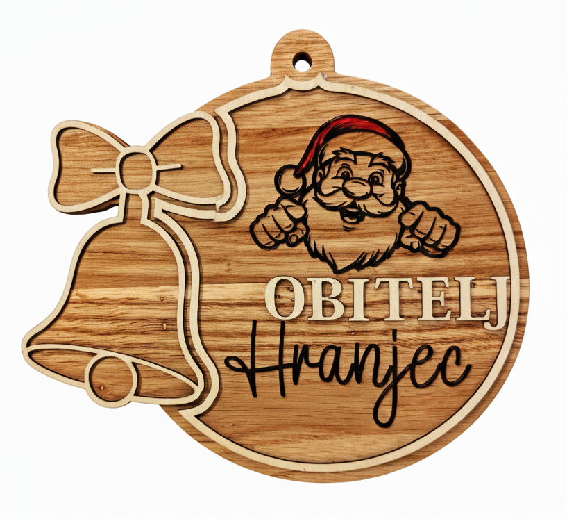 Efektan 3D Dizajn: Kombinacija slojeva drva i laserskog rezanja stvara atraktivan, trodimenzionalni izgled. Centralni motivi su veseli Djed Božićnjak i stilizirano zvono s mašnom.