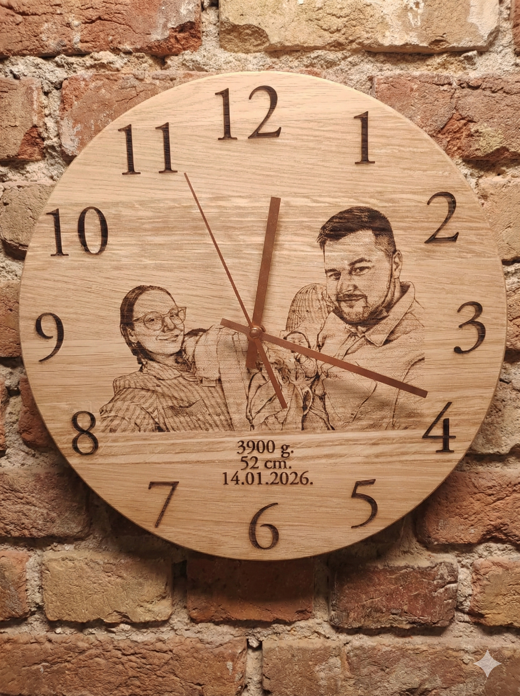 Ovaj sat nije samo dekoracija; on je priča o vašoj obitelji. Savršen je za obilježavanje posebnih trenutaka poput rođenja djeteta, vjenčanja ili godišnjica. Na donjem dijelu sata graviramo podatke koji su vama važni (datum, težina, duljina ili kratka posveta), dok središnji dio krasi vaša omiljena fotografija pretvorena u trajni drveni portret.